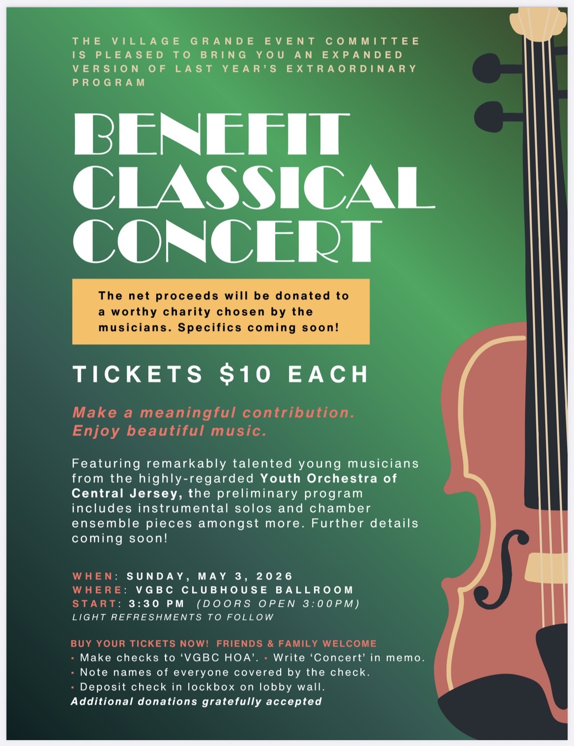 This May 3, 3:30pm Benefit Classical Concert features remarkably talented students from the Youth Orchestra of Central Jersey. All proceeds will be donated to a worthy charity. This performance will be held at the Village Grande Clubhouse Ballroom.